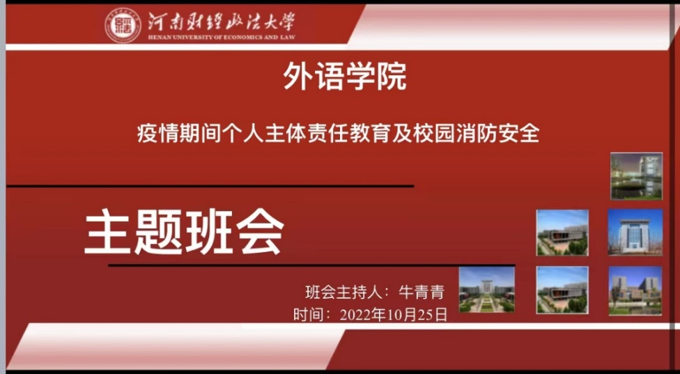 10月25日,外语学院以线上的方式召开了“树立主体责任意识,增强自律自护能力”主题班会。本次会议由外语学院各辅导员老师分班召开,外语学院全体师生参与。