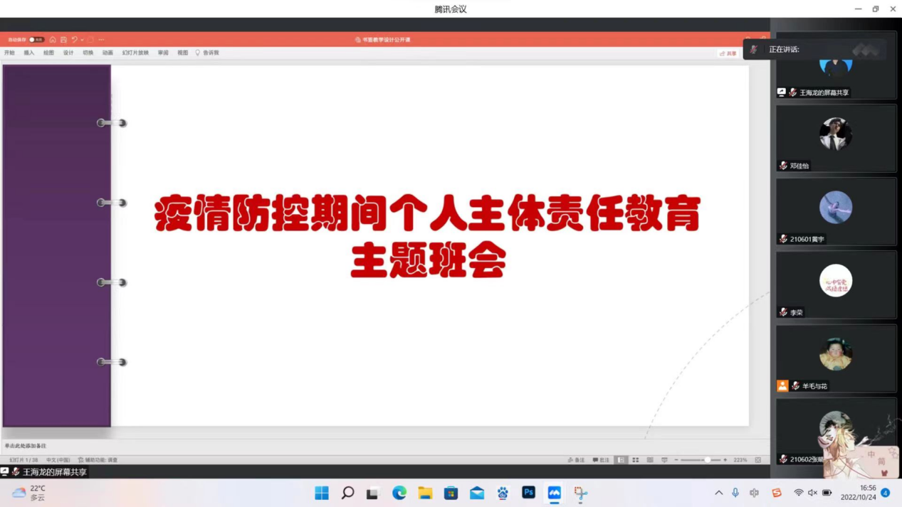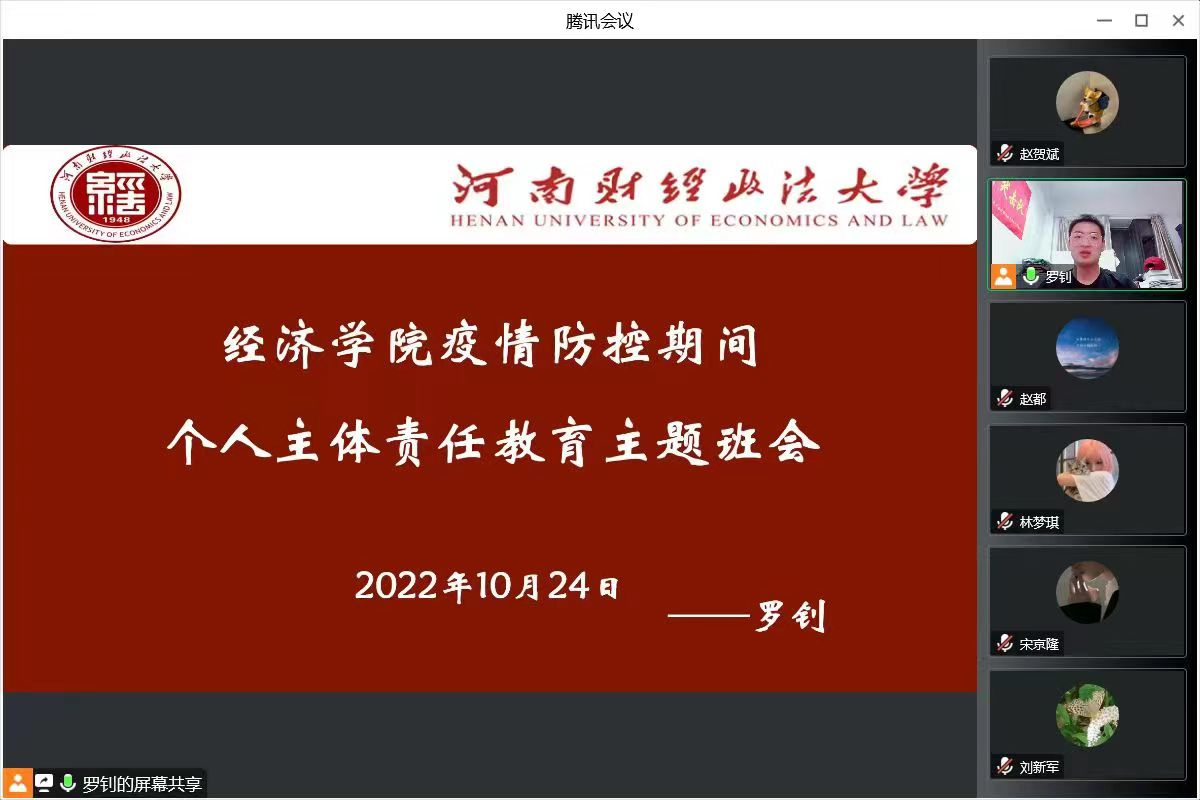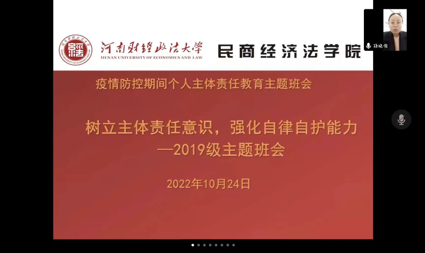 为落实疫情防控相关要求,做好学校当前的疫情防控工作,确保师生生命安全、身体健康和校园稳定,民商经济法学院于10月24日、25日以线上会议的形式,面向全体学生开展主题为“树立主体责任意识,强化自律自护能力”的疫情防控主题班会,班会由各年级辅导员主讲。