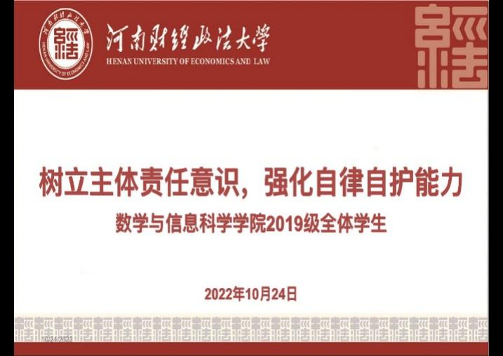 按照学生处的要求,计算机与信息工程学院迅速行动,10月24日至10月25日,各年级辅导员通过线上的形式给各年级学生开展了以“树立主体责任意识,强化自律自护能力”为主题的班会。