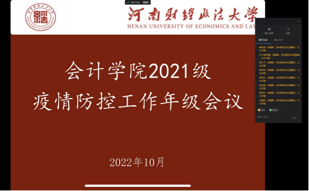 为落实上级及属地疫情防控相关要求,确保校园稳定,增强学生主体责任意识,会计学院于2022年10月24日组织学院全体学生开展疫情防控教育线上主题班会。