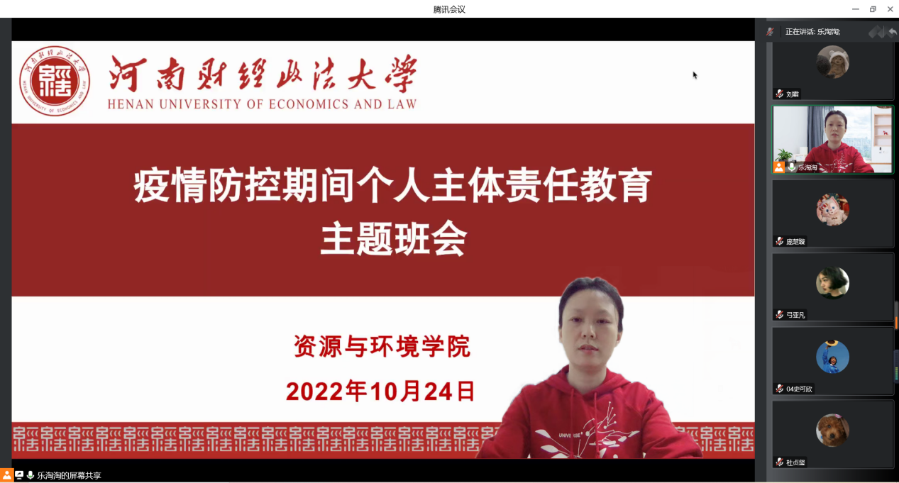 为落实郑州市及校园疫情防控要求,确保师生健康和校园稳定,10月24日晚,资源与环境学院辅导员林琳、高鹏分别通过钉钉会议、腾讯会议等线上平台召开了各年级疫情防控主题班会,学院全体学生参加此次会议。