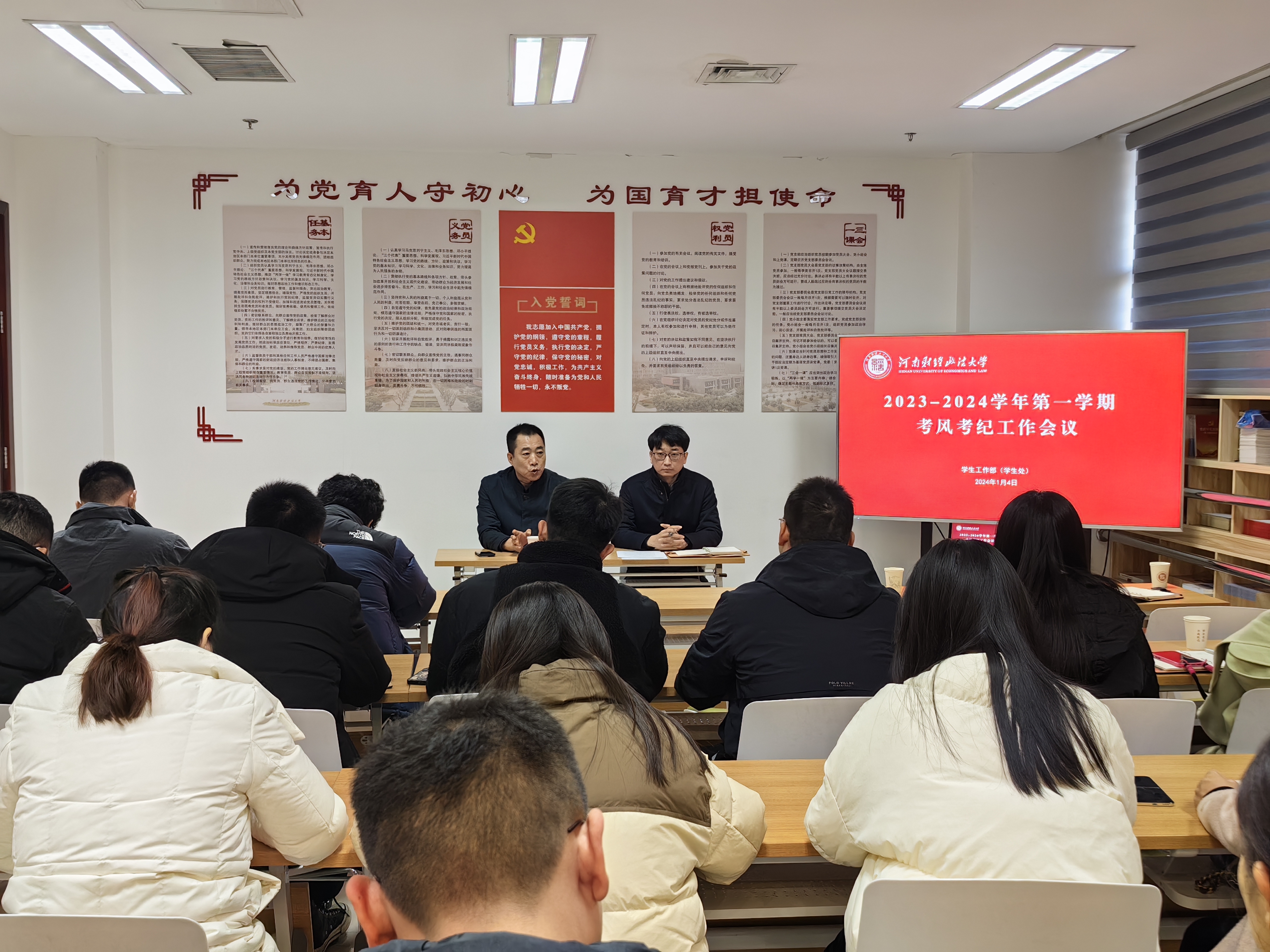 为规范考场秩序,净化考场环境,培养学生诚信品格,推动形成优良考风学风。1月4日上午,学工部在行政楼226会议室召开考风考纪工作会议,会议由学工部部长崔炜主持,学生处副处长王韧,各学院辅导员参加会议。